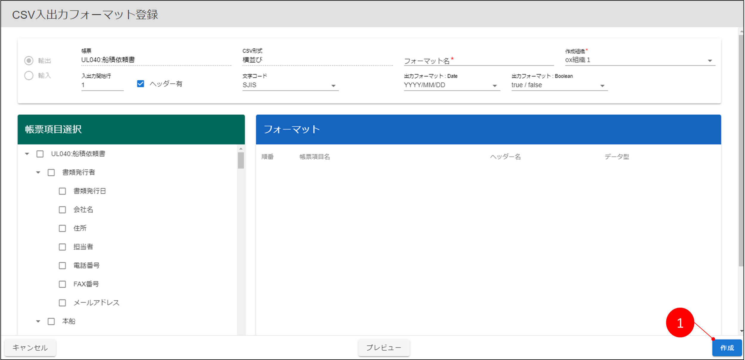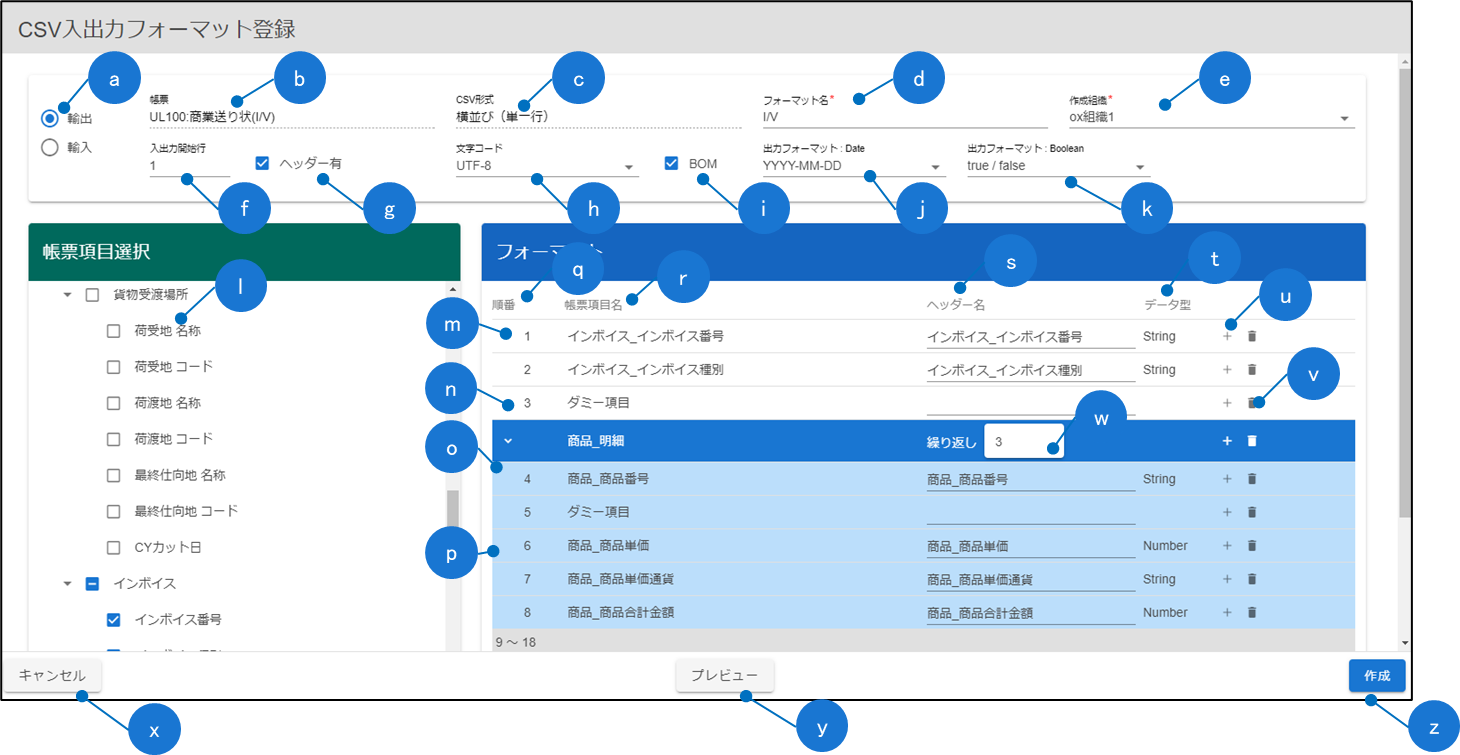 | z | 保存ボタン | フォーマットを登録します。 新規作成の場合は「作成」、コピーの場合は「コピーの場合は「新規の CSV 入出力フォーマットとして作成」と表示が変わります。 |