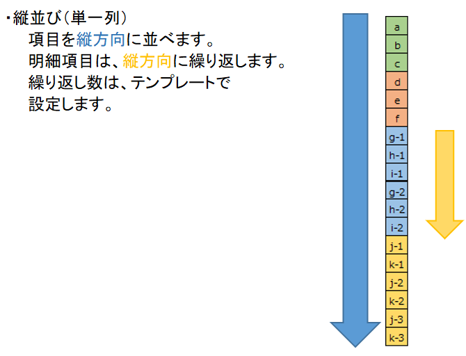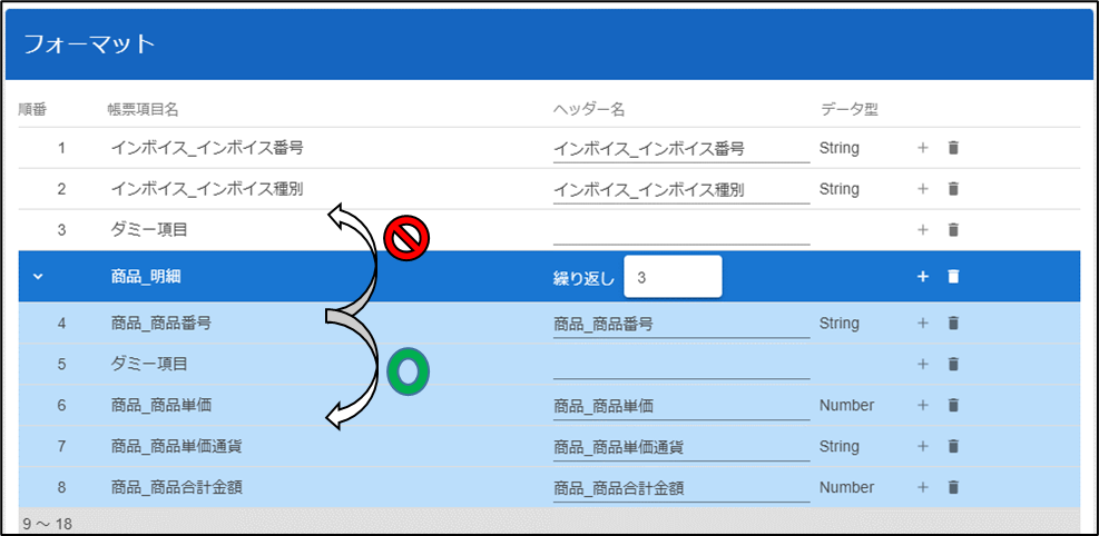 | w | 繰り返し | 明細項目の繰り返しを設定します。 CSV 形式が横並び(単一行)、縦並び(単一列)の場合に表示されます。 |
