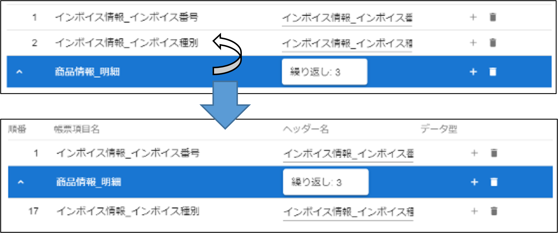 明細グループ(青色の行)をドラッグすると、明細項目全体の順番を移動します。 明細項目が多く、ドラッグがしにくい場合は明細グループの左部を押下して折りたたんでください。