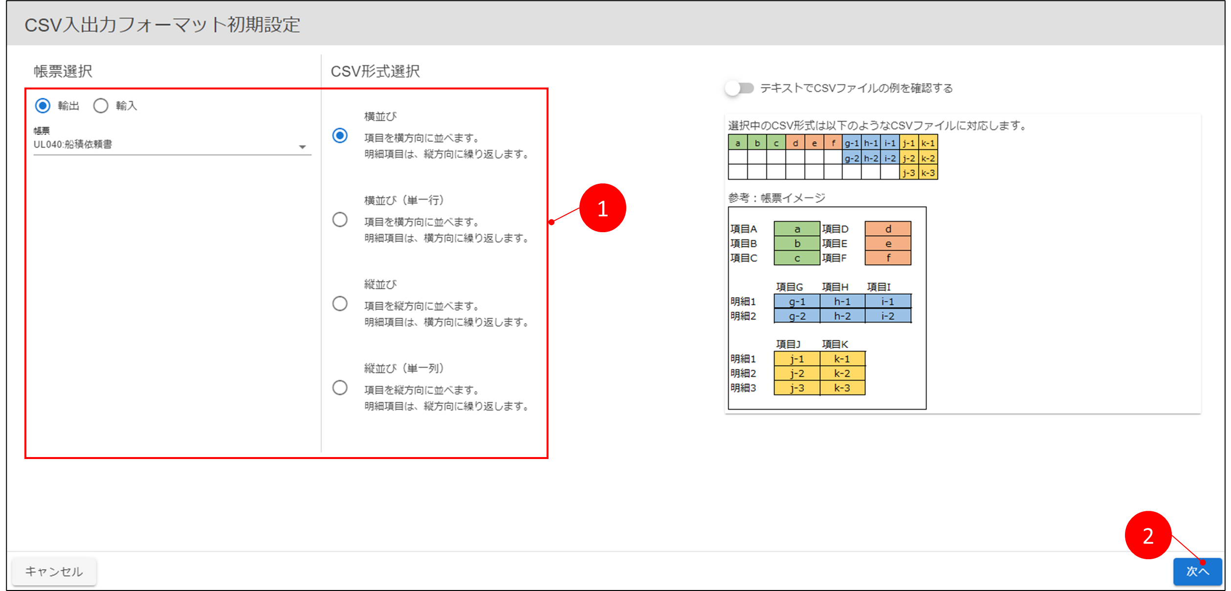 「次へ」ボタンを押下し、「CSV 入出力フォーマット登録」を表示します。