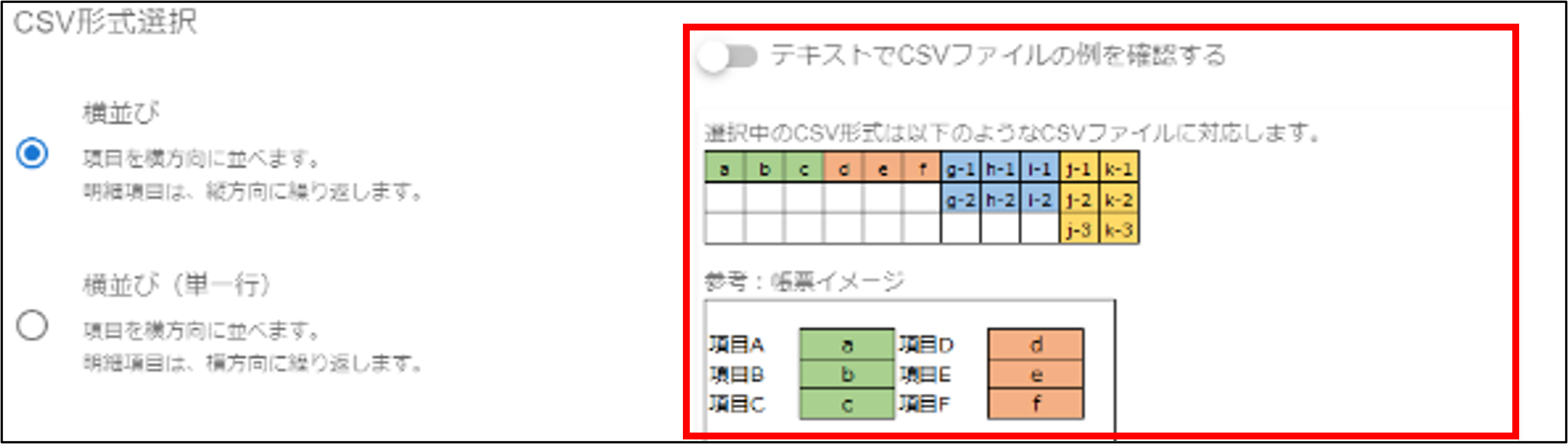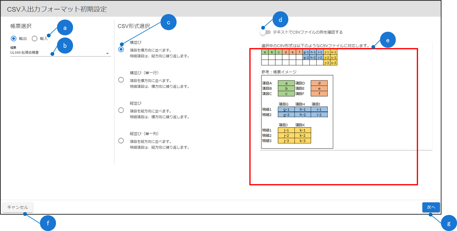 形式を選択します。 CSV 形式を選択すると、項目「e.CSV ファイルの例」に選んだ CSV 形式の例を表示します。 |