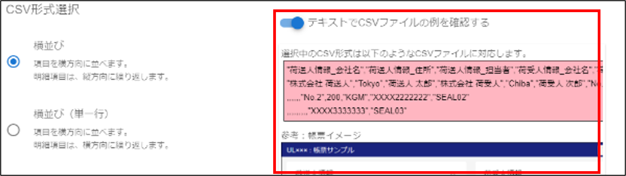 ON の場合 : CSV ファイルの例をテキスト表示で示します。