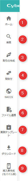 メニューの各アイコンを押下する事により、「ダッシュボード」「取引の検索」などの各ページへ移動することができます。