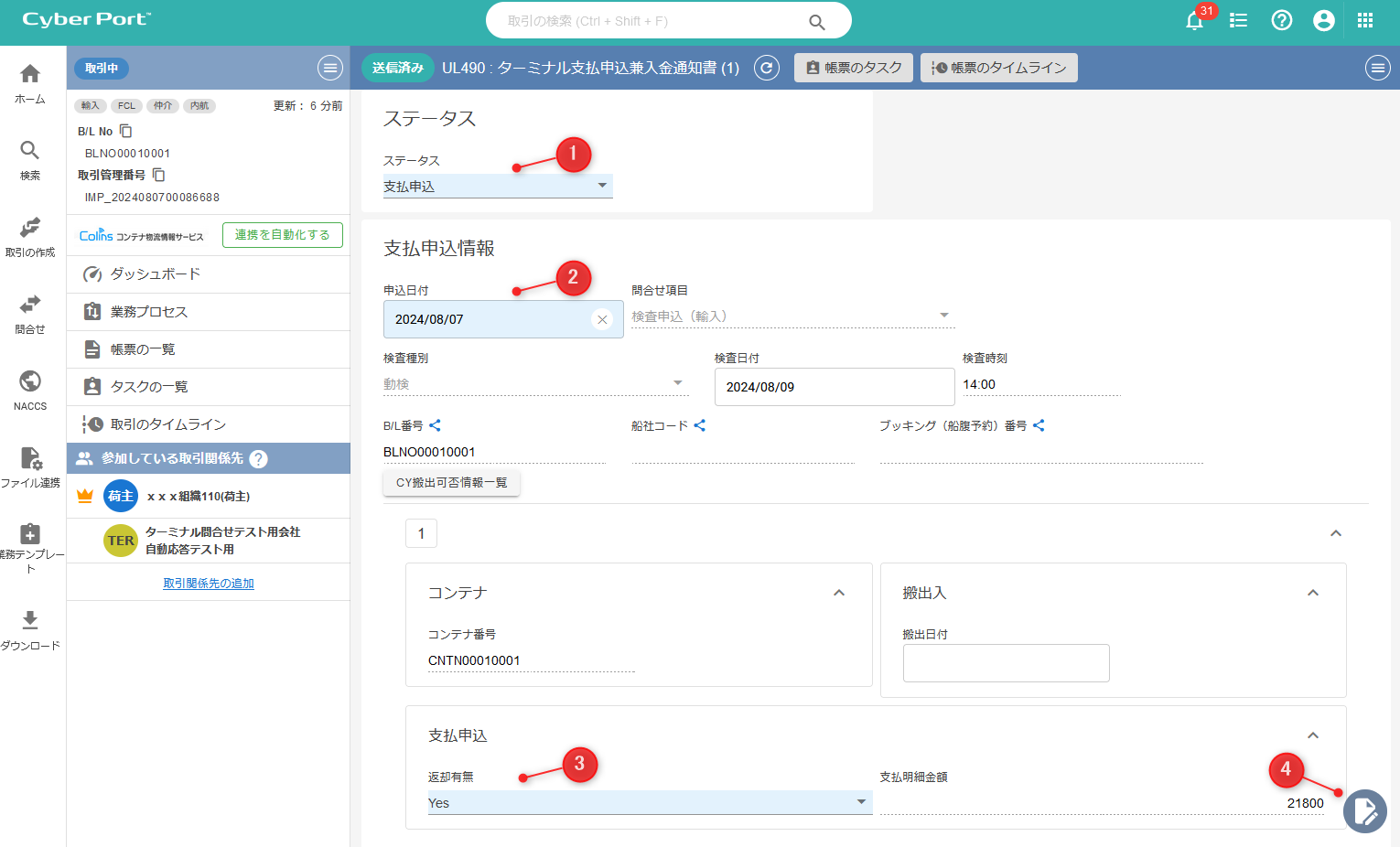 ターミナルへ伝達事項などがある場合は、摘要欄や備考欄をあわせてご利用ください。