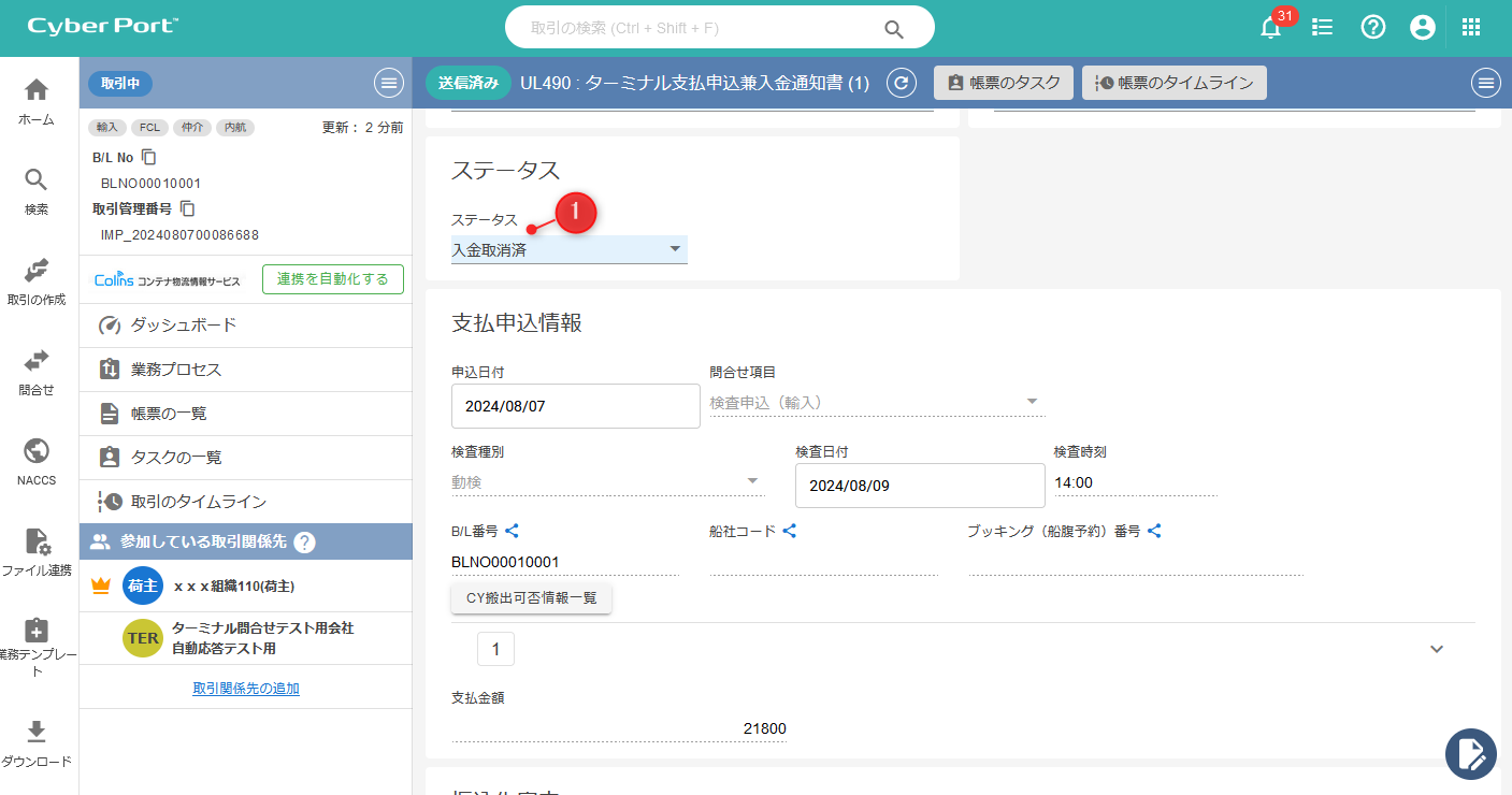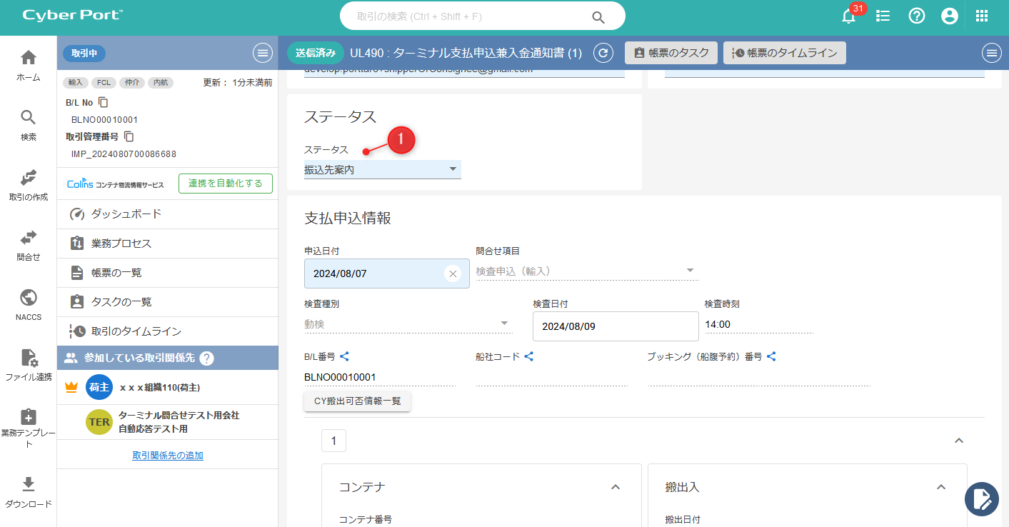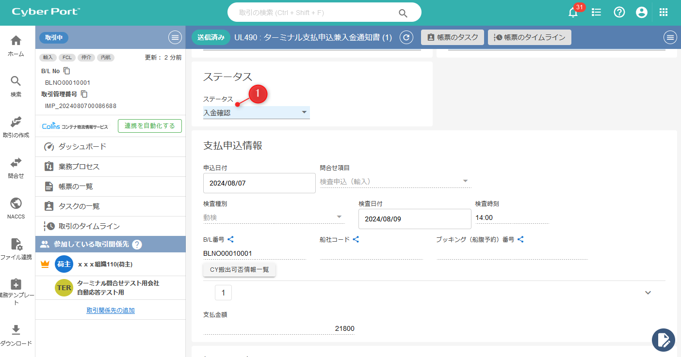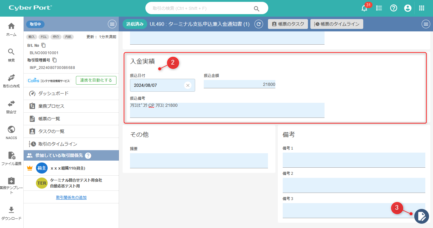 ターミナルから伝達事項などがある場合は、摘要欄や備考欄に記載されている場合があります。