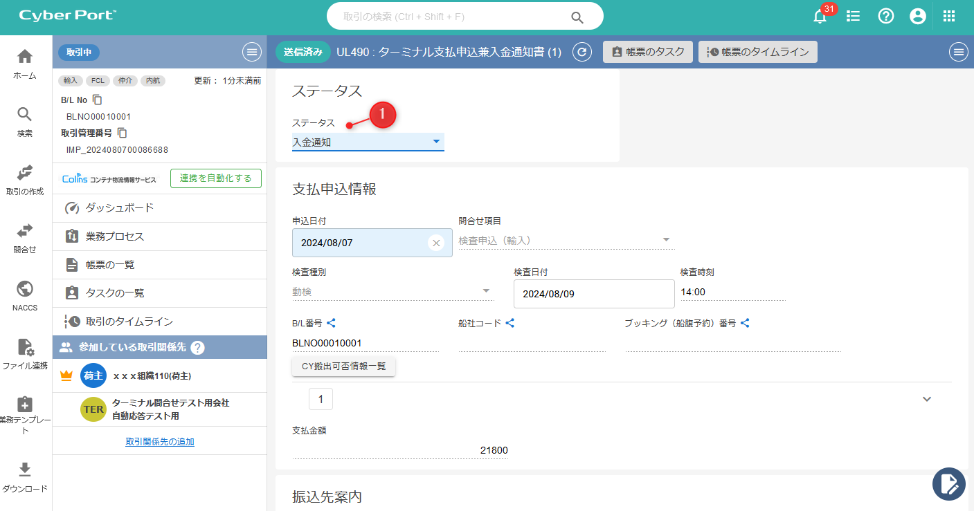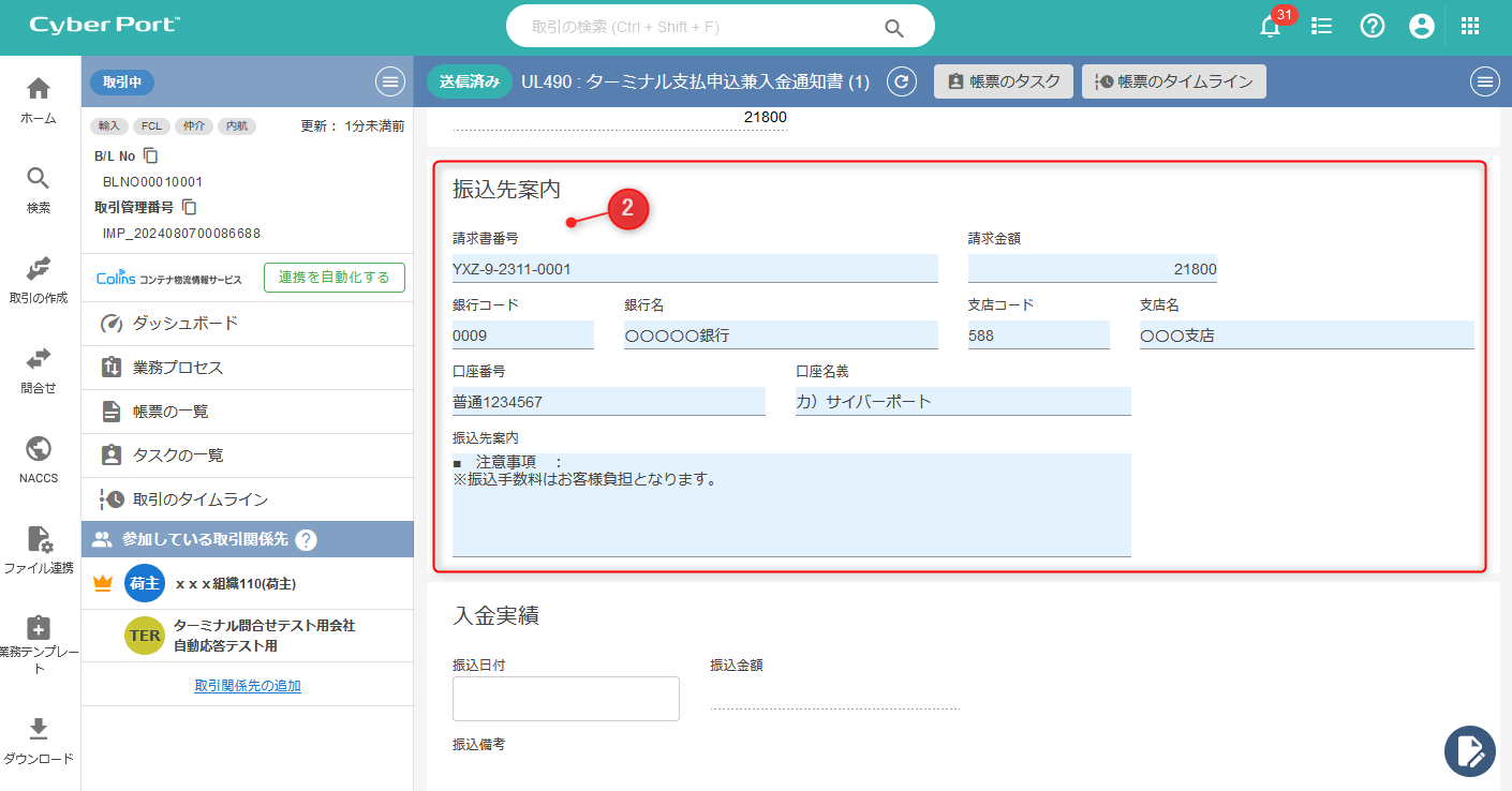 ターミナルからの回答(振込先案内、請求金額等)の確認が行えます。
