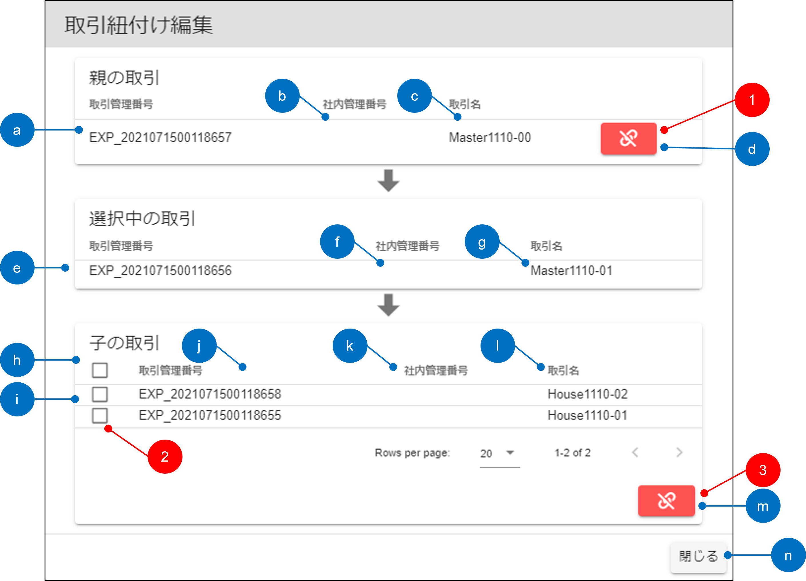 | m | 子の紐付け解除ボタン | 押下することで選択された子取引との紐付けを解除します。 子取引がない場合は表示されません。 |