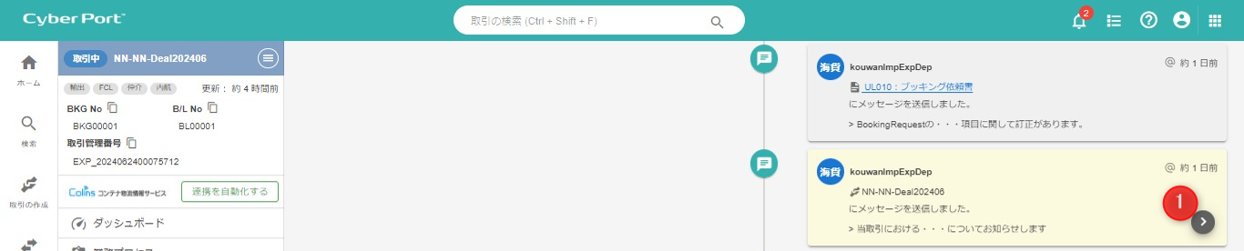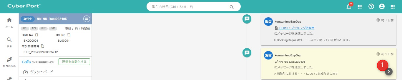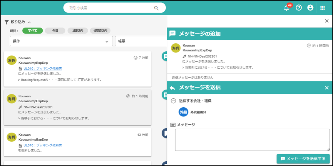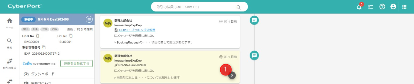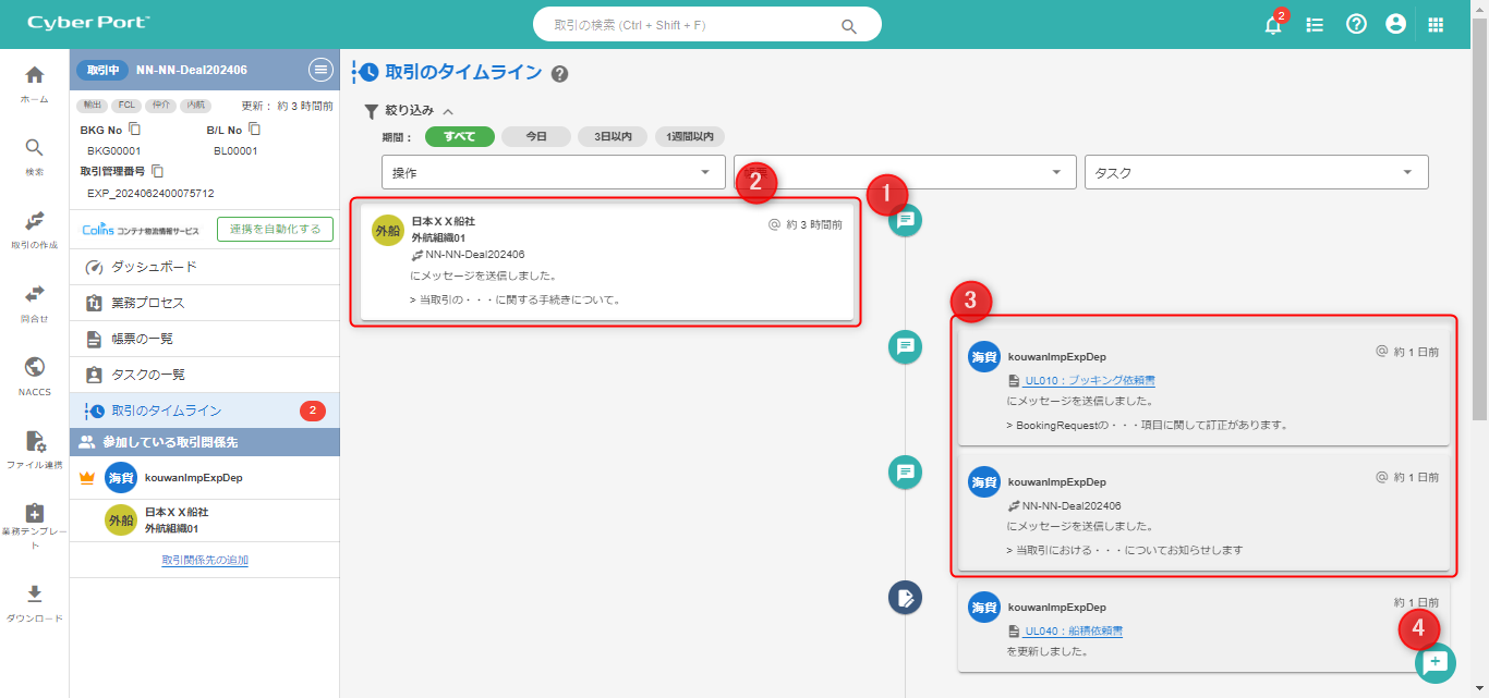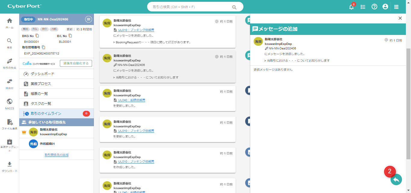 「取引のタイムライン画面」または「帳票のタイムライン画面」より確認したいメッセージの「履歴詳細画面」を開きます。