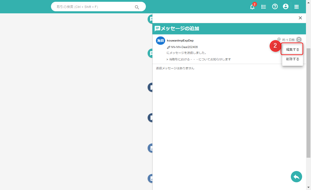 「取引のタイムライン画面」または「帳票のタイムライン画面」より編集したいメッセージの「履歴詳細画面」を開きます。