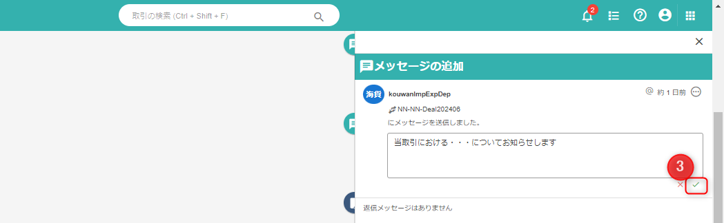 「返信」アイコンを押下すると、メッセージの送信元に宛てたメッセージを作成することができます。