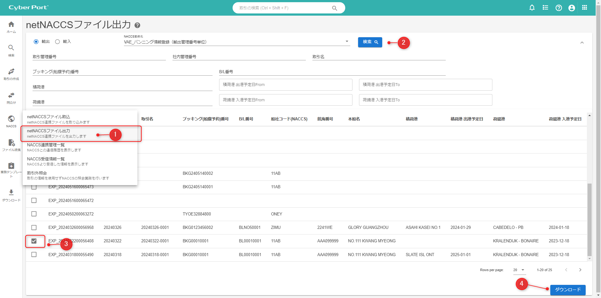 「ダウンロード」ボタンを押下する事で、選択した取引の netNACCS 用データファイルをダウンロードします。