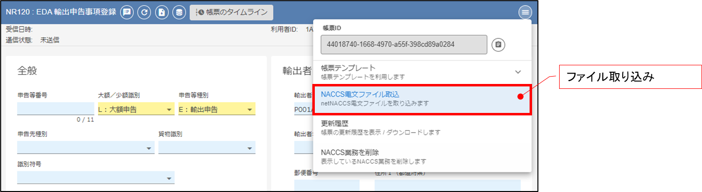※ EDA、IDA は、それぞれの画面の帳票メニュー「NACCS 電文ファイル取込」より取込が可能です。