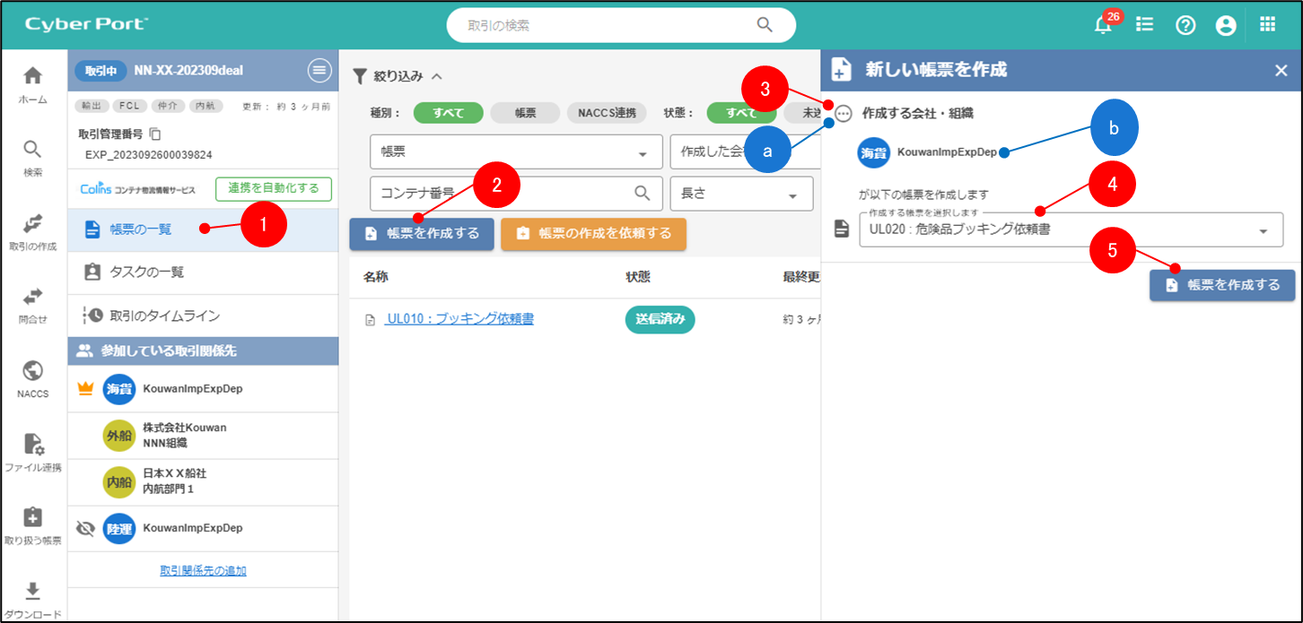 | a | 帳票を作成する会社・組織の選択 | アイコンを押下するとユーザーの所属している組織のうち当該取引に参加中の組織が一覧表示されます。 選択した組織が「帳票を作成する組織」となります。 |