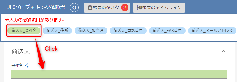 メッセージ内の項目は、クリックすると、帳票の当該項目へカーソルが移動し、未入力の項目が追跡できるようになっています。