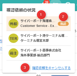 ステータス 意味 依頼中 既読確認が依頼中の状況です。 完了 既読確認を依頼した取引関係先が全て既読操作をした場合に完了になります。 キャンセル 「確認依頼をキャンセルする」の操作をした場合にキャンセルになります。 更新日時
