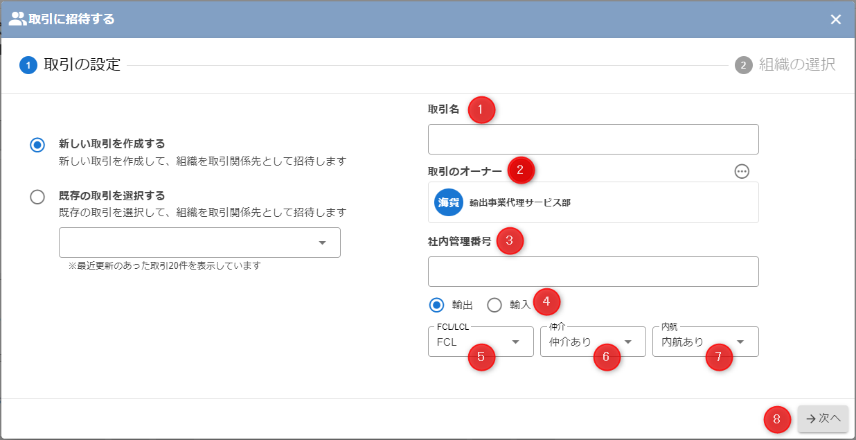 新しく作成する取引のオーナーとなる組織を、利用者が所属している組織から選択します。