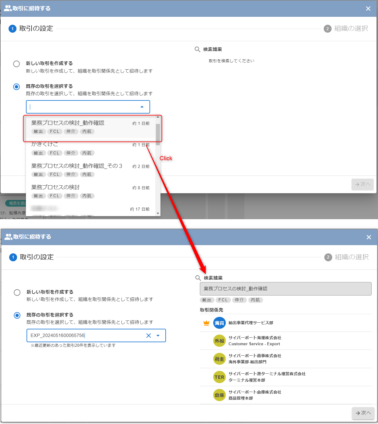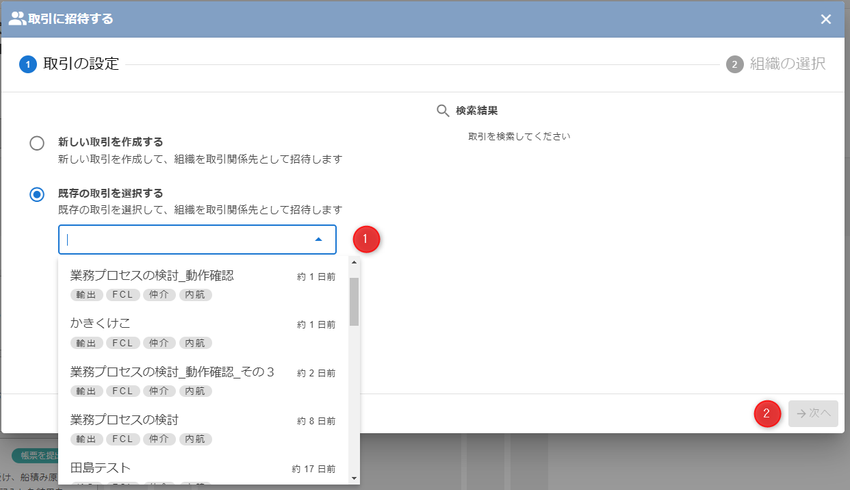会社の検索にて、一覧に表示された組織を、この画面から直接、取引に招待(参加)することが出来ます。