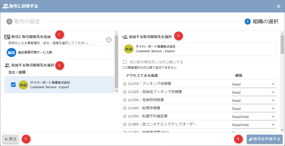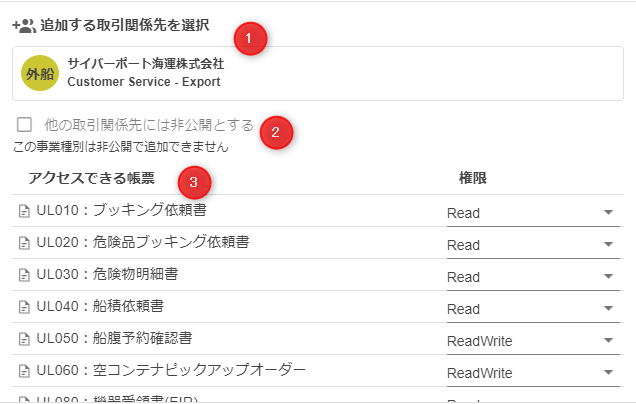 取引関係先として追加する事業者(会社・組織・事業種別)が、取引内でアクセスできる帳票の権限を設定します。
