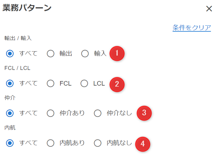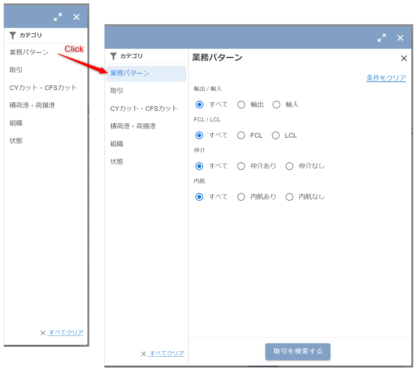 表示中の条件入力パネル内の右上にある”条件をクリア”をクリックすると、入力中のカテゴリの条件がクリアされます。 ※この時点では取引の一覧は更新されません。取引の一覧を更新する場合は、“取引を検索する”(または”条件を更新する”)ボタンをクリックしてしてください。
