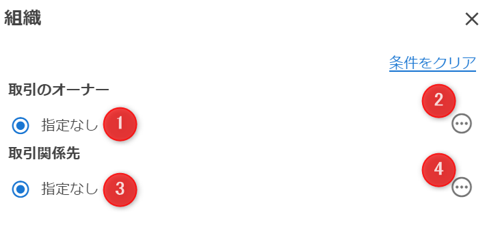 取引のオーナーとなっている組織・事業種別や取引に参加している取引関係先(会社・組織・事業種別)を検索条件として入力します。