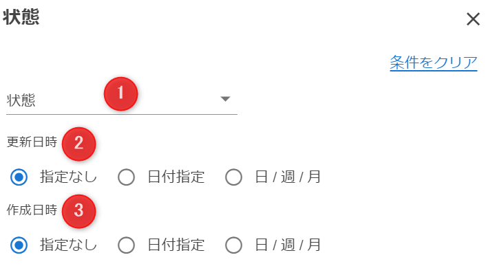 条件入力パネルの日付項目には、指定なし・日付指定・日 / 週 / 月 の3パターンでの検索条件が入力できます。