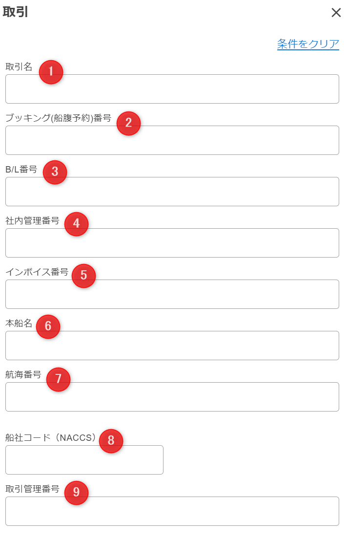 取引の基本情報である取引名やブッキング番号などを検索条件として入力します。