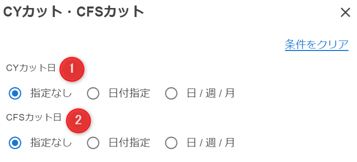 検索したい取引のCYカット日についての検索条件を入力します。