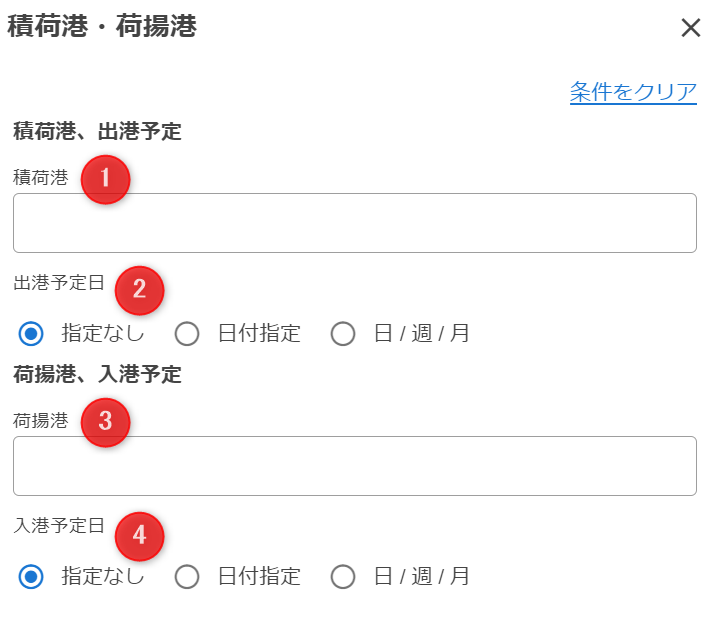 積荷港、出港予定日と荷揚港、入港予定日を検索条件として入力します。