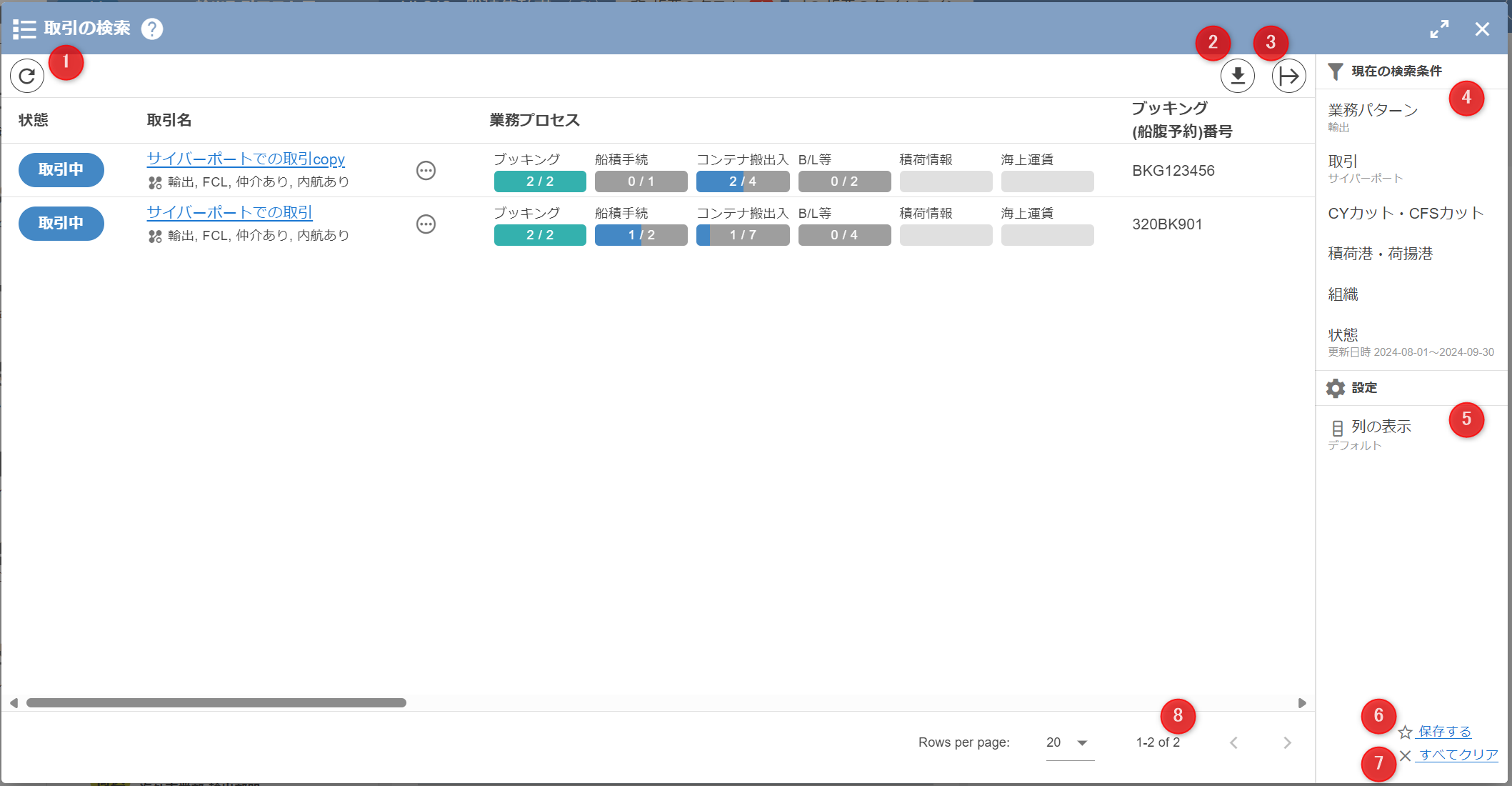 取引の検索を実行後、検索条件に該当する取引の一覧を表示します。