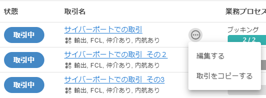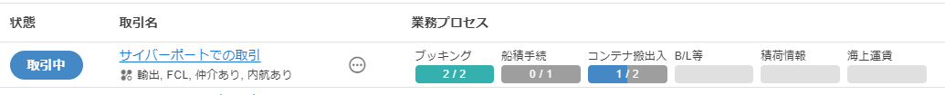 | 業務プロセス | 取引内での業務プロセスの進行状況を、業務カテゴリ毎にステータスバーのスタイルで表示します。 | CSVファイルには出力されません。近日対応予定です。 |