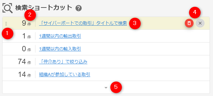 検索ショートカットとして保存された検索条件に該当する取引の件数を表示します。