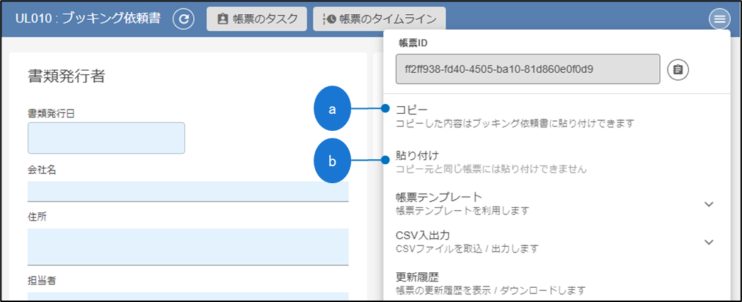 | b | 貼り付け | 押下すると全項目の値が「コピー」押下時の内容で上書きされます。 ※ ペーストが可能な帳票はコピーと同様です。 帳票メニューに「貼り付け」が表示される条件は以下のとおりです。 ・ 事前に「コピー」が押下されている ・ コピーした帳票と同一種類の帳票である(コピーした帳票自身を除く) |