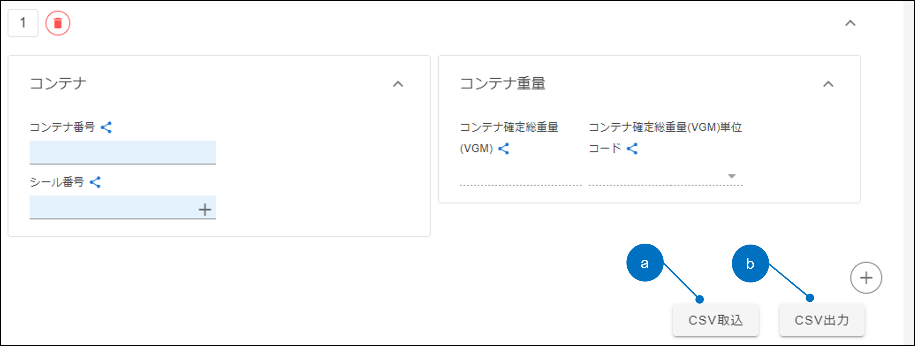 | a | CSV 取込ボタン | 押下することで取込対象のCSVファイルを選択するためのファイル選択ダイアログが開きます。ファイルを選択すると取込処理が行われ、取り込んだデータが明細部に表示されます。 |