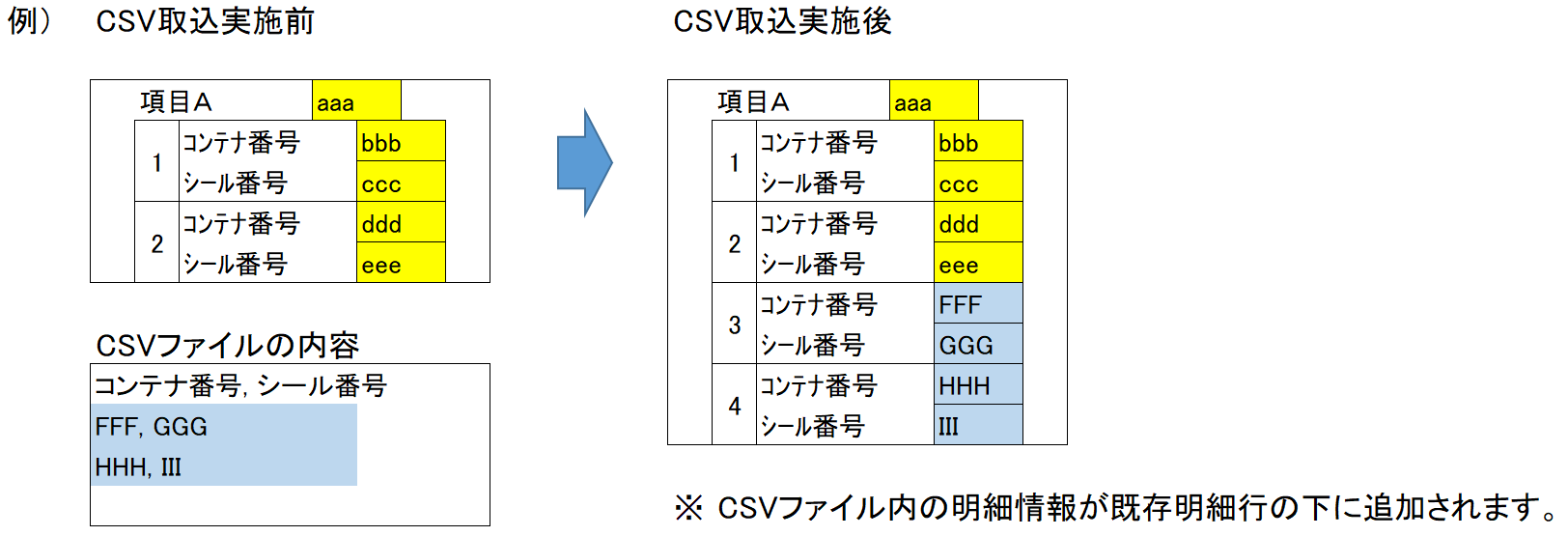 ※ CSV ファイルの内容は、既存の明細部に対して上書きすることなく、行追加されます。