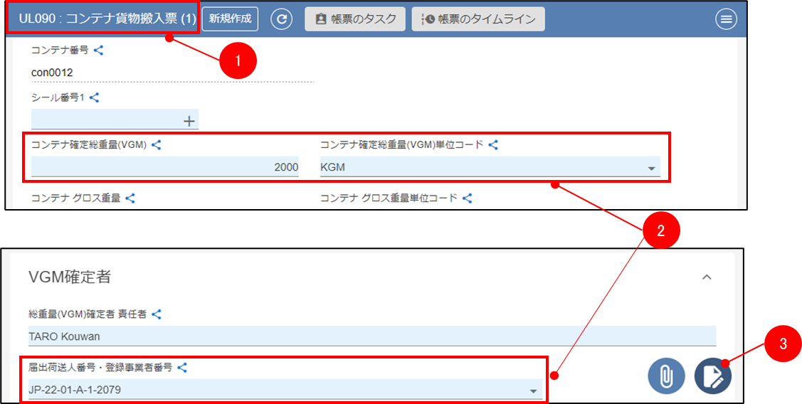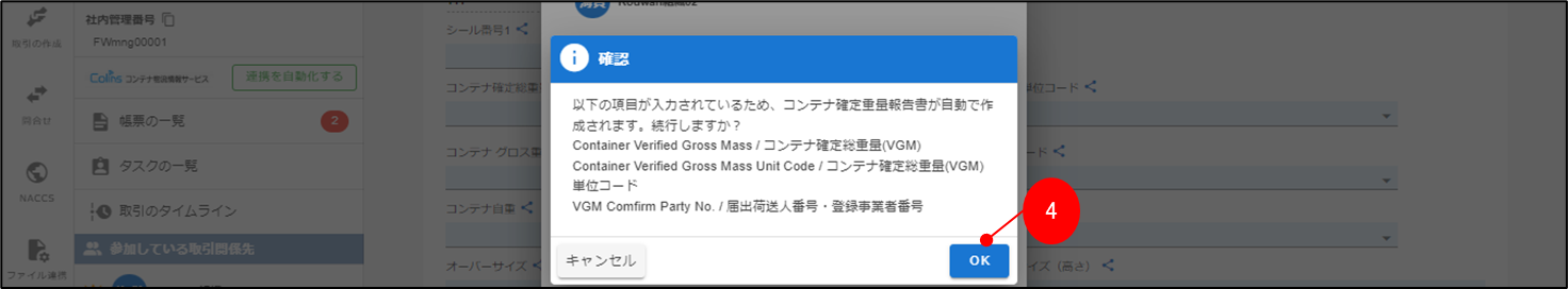 3項目に入力があり、コンテナ確定重量報告書が未作成の場合は、