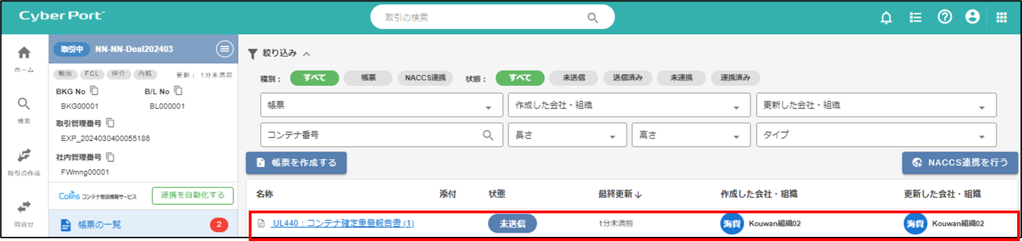 新規作成されたコンテナ確定重量報告書は「取引の帳票一覧画面」に表示されます。