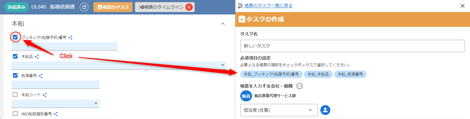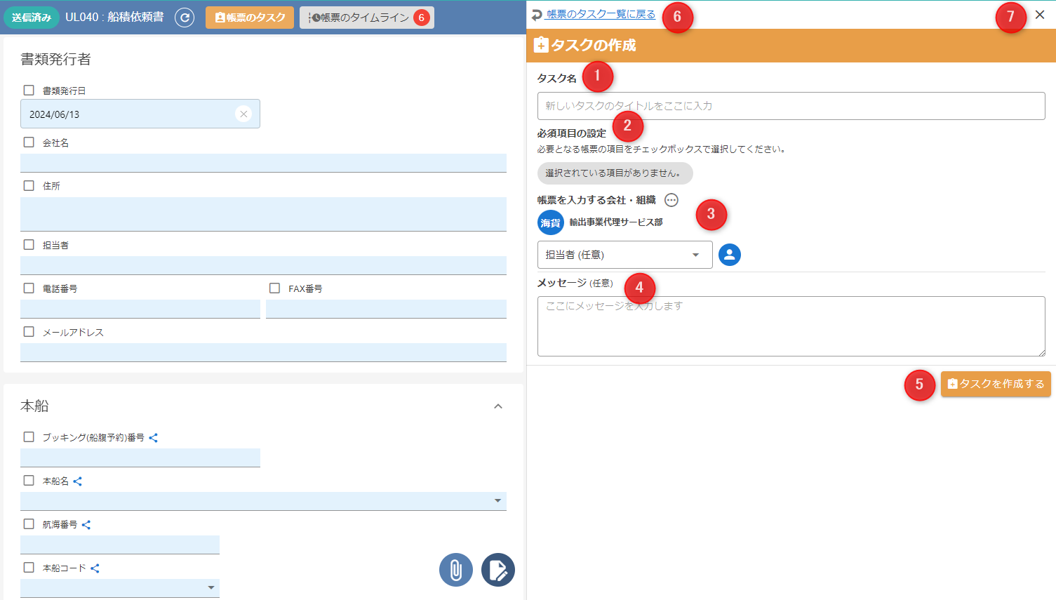 入力された内容で、 開いている帳票に対し、タスクを作成します。