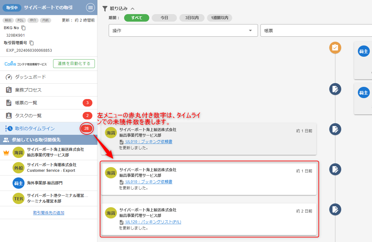 取引の左メニュー「取引のタイムライン」は、取引内で行われた操作についての未読件数を表示します。