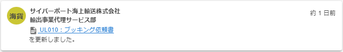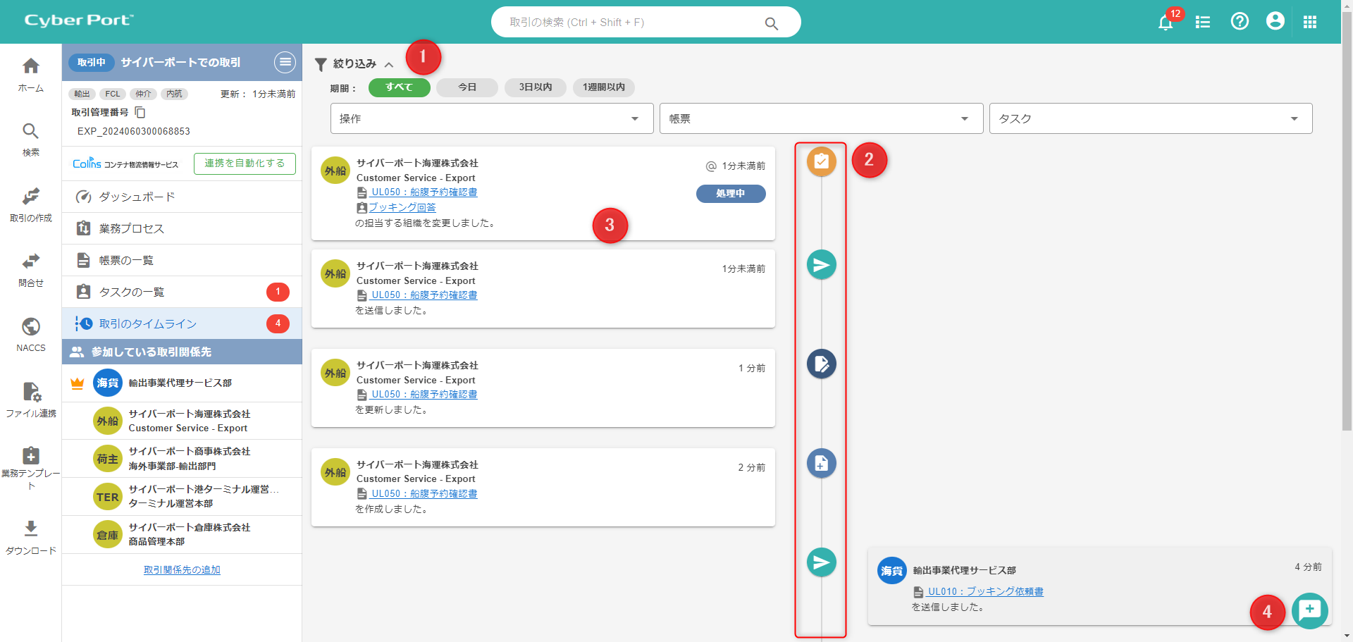 取引の左メニュー「取引のタイムライン」をクリックすると、その取引内で行われた行われた取引、帳票、タスク、メッセージについて操作履歴を時系列で表示します。