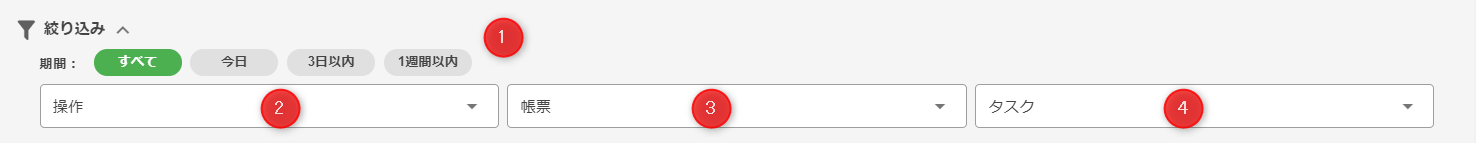取引のタイムラインを期間、操作、帳票、タスクで絞り込みます。