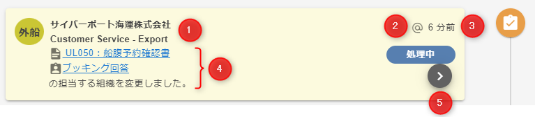 操作履歴カードには、操作タイムラインで表示している操作を、いつ、どの組織が、取引・帳票・タスク・メッセージに対して、どのような操作を行ったのかを表示します。