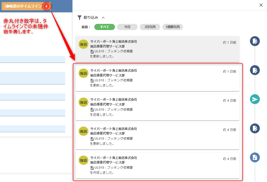 左メニューと同様に、赤丸付き数字は、タイムラインでの未読件数を表します。