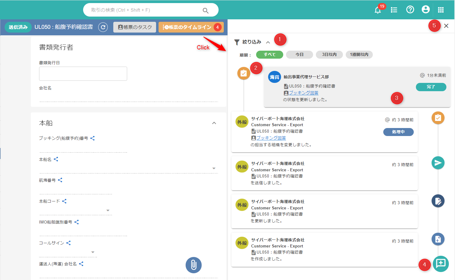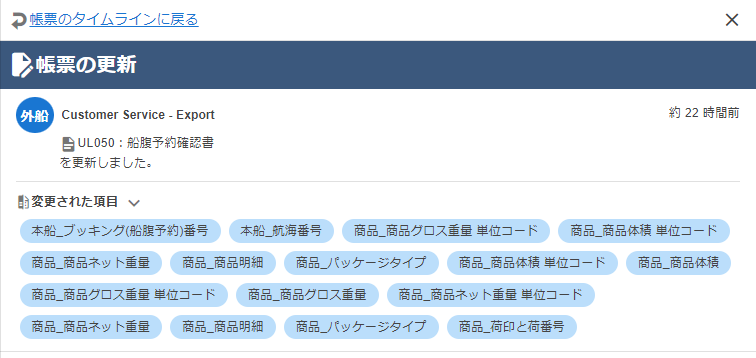 帳票のタイムラインでは、その帳票内で行われた取引、帳票、タスク、メッセージについて操作履歴を時系列で表示します。