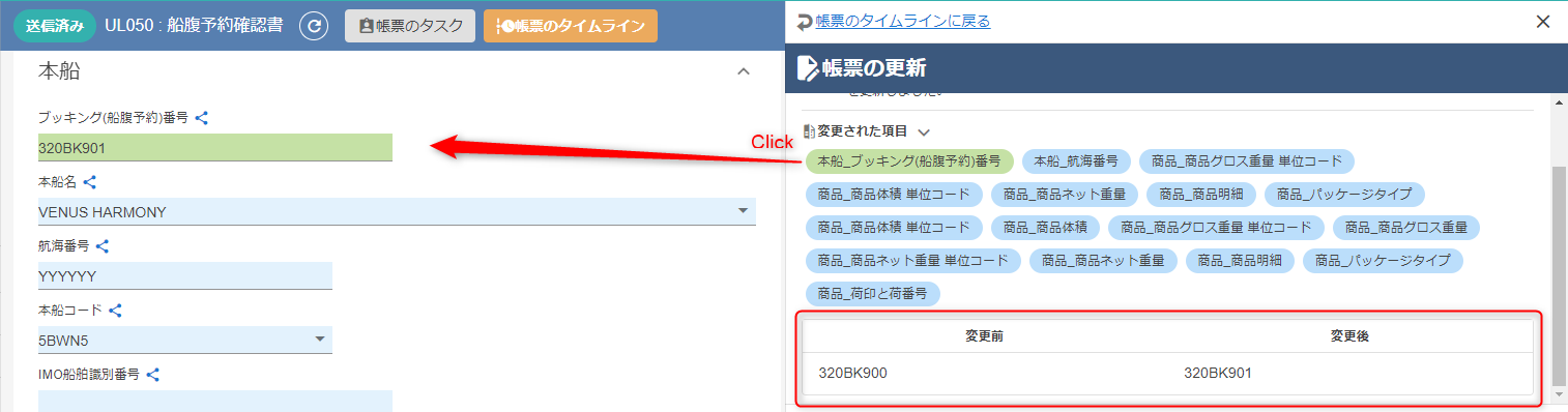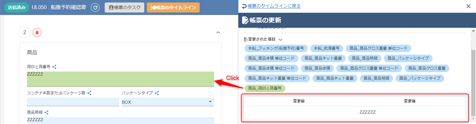 操作が帳票の更新の場合、直前の更新との 変更された項目を確認する ことが出来ます。