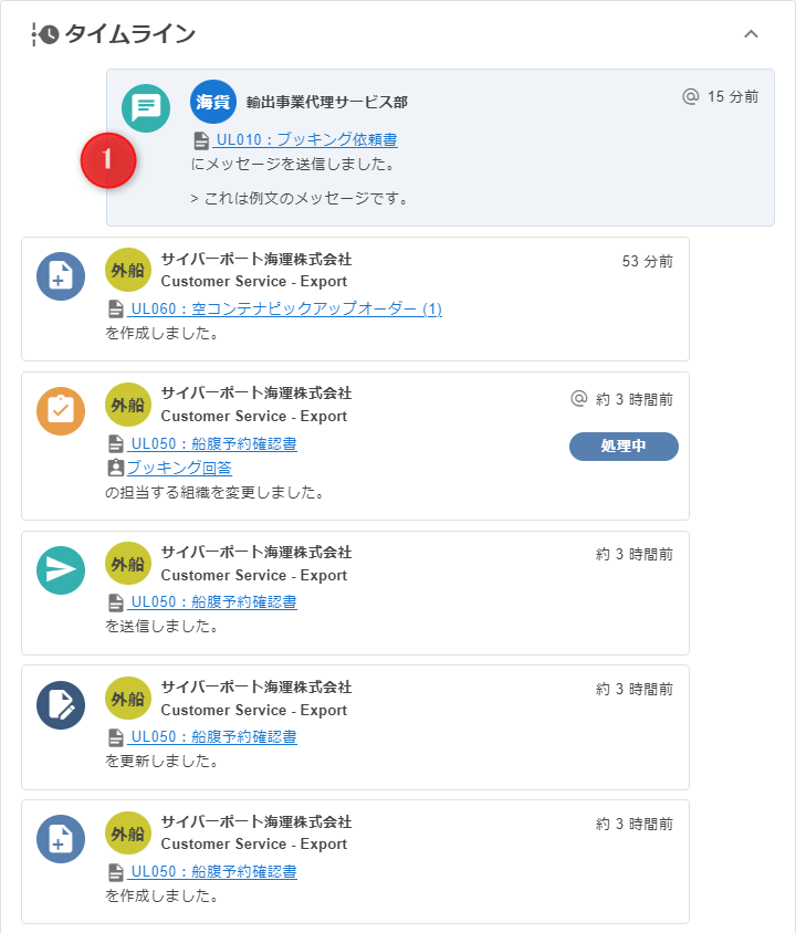 の縮小版としての機能であり、操作履歴カードの詳細表示はできませんが、その取引内で行われた行われた取引、帳票、タスク、メッセージについて操作履歴を最新のものから時系列に表示するのは、取引のタイムライン