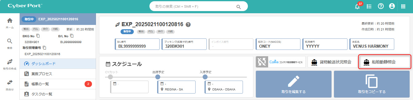 取引内の帳票間でデータを共有している項目(ルートドキュメント)の港コードとコールサインで船舶動静を照会します。