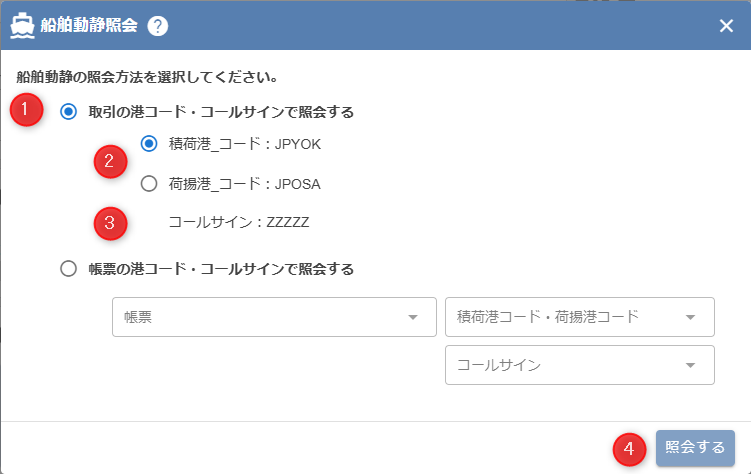 「取引の港コード・コールサインで照会する」を選択すると、取引のルートドキュメントで船舶動静を照会できます。