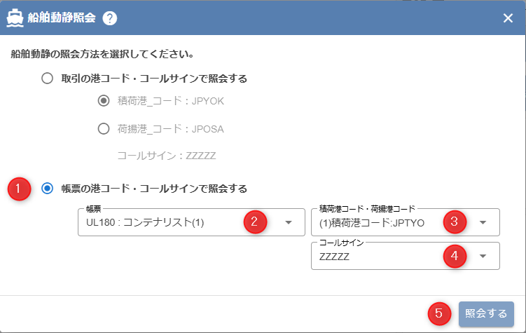 「帳票の港コード・コールサインで照会する」を選択すると、帳票個別の項目で船舶動静を照会できます。